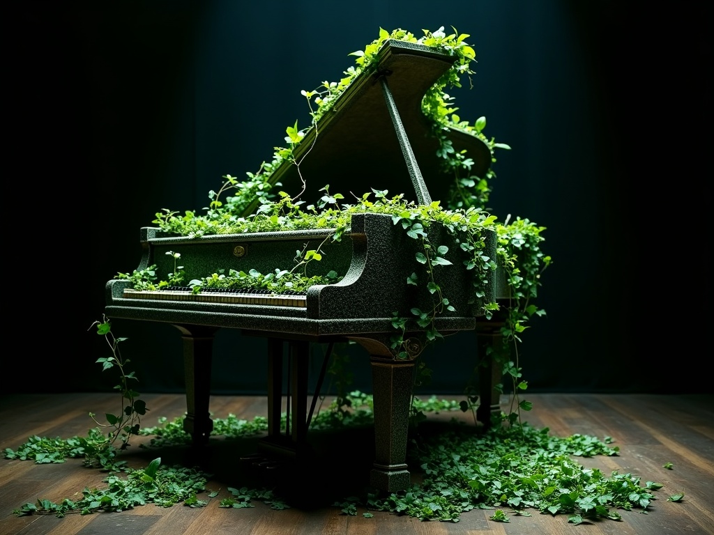 A concert grand piano on a theatre stage, completely consumed by dark emerald ivy — the vines have woven through the strings creating a living instrument, dark green leaves covering the lid, tendrils curling around the pedals, a single spotlight illuminating the overgrown instrument, abandoned beauty, 8k