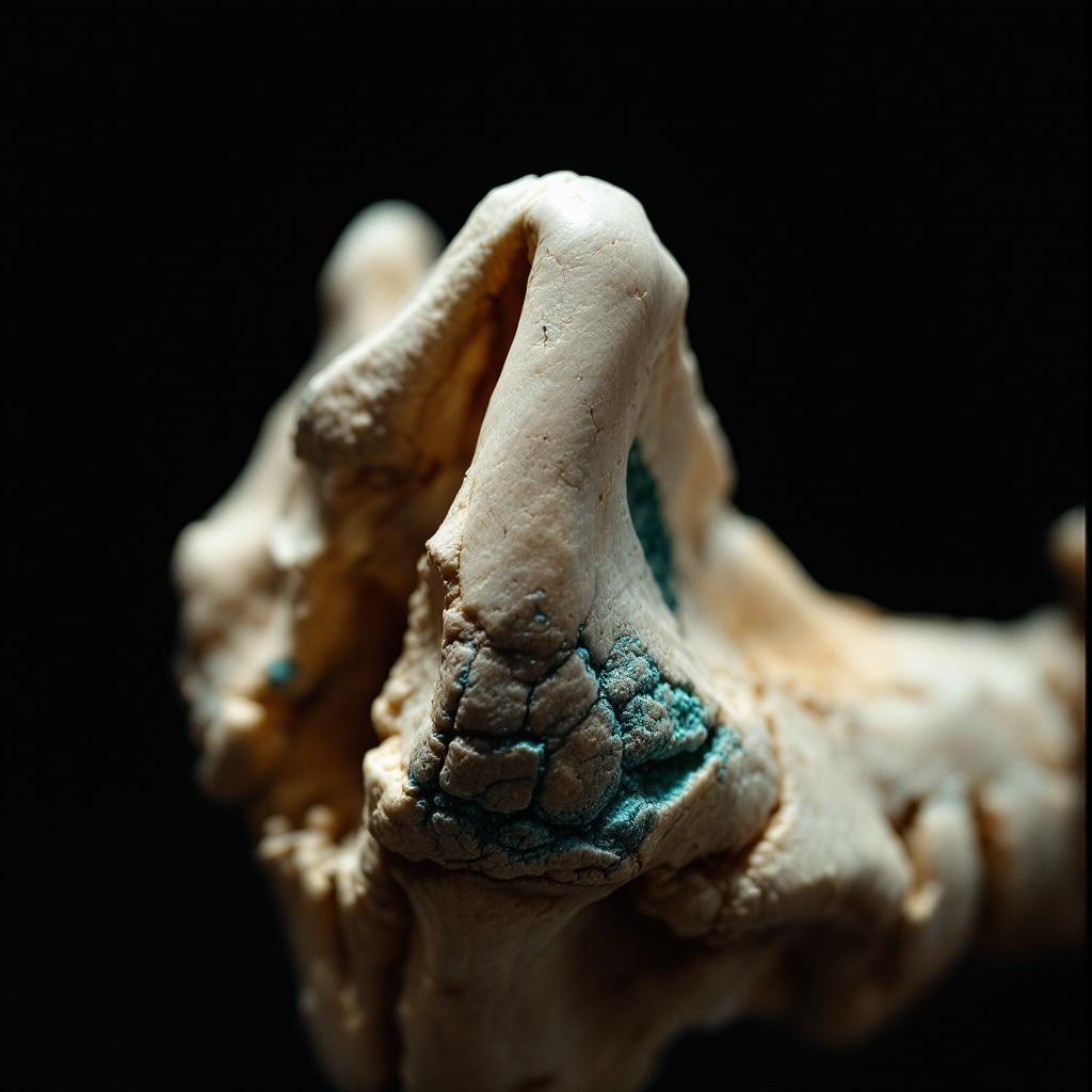 Close-up of a prehistoric jawbone emerging from darkness, pale bone with subtle turquoise mineral veins, dramatic museum lighting, dark natural-history photography