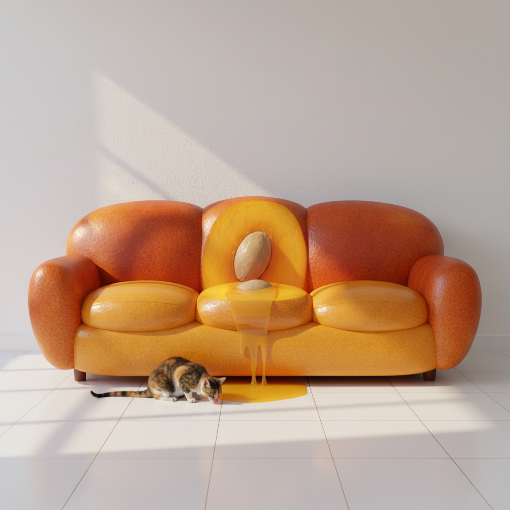 A three-seater sofa in a minimalist white room, made entirely from ripe mango — the bright tangerine flesh smooth and glistening, the deep amber-orange mango skin forming the sofa back like leather, one seat cushion sliced open revealing the golden fibrous interior and a large flat pit, sweet juice dripping down the front onto white floor tiles, a cat licking the base, tropical warm light, 8k