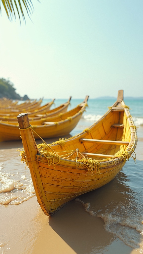 A fleet of fishing boats pulled onto shore, their hulls made entirely from woven canary-yellow straw and pale yellow thread, clean coastal light, textured surfaces, grounded environment, realistic, 8k