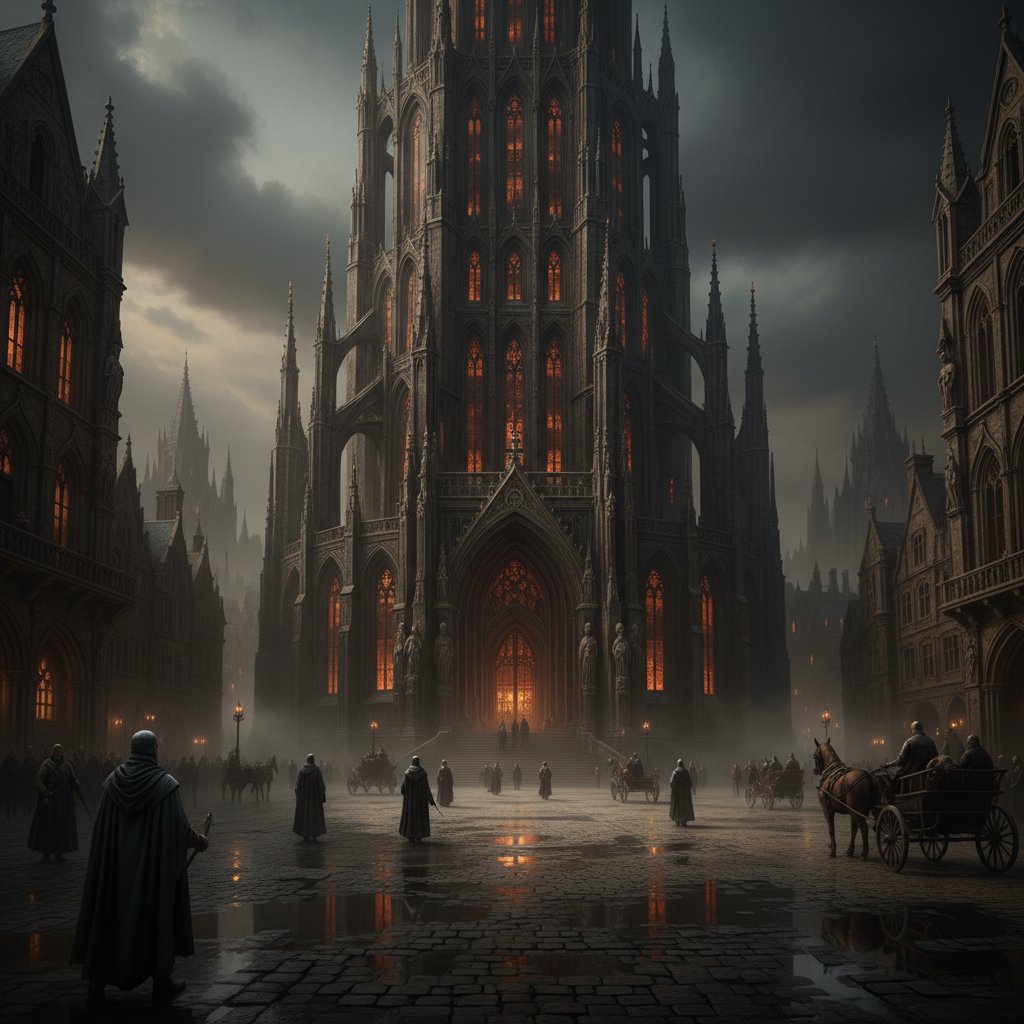 A single immense gothic tower rising from a dark brown city square, narrow windows glowing like embers, wet stone below, heroic medieval atmosphere