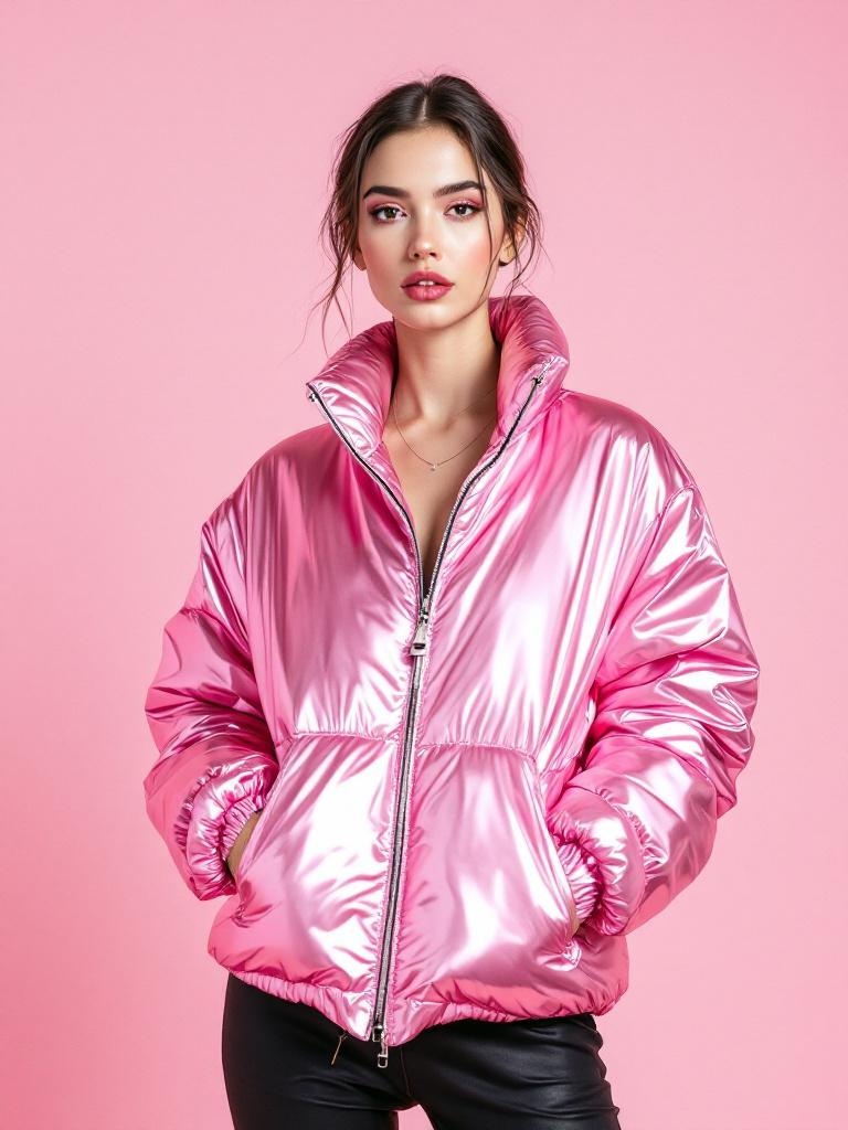 A woman in a glossy pink chrome jacket standing against a pale pink backdrop, hibiscus highlights on the folds, direct fashion portrait, sharp focus