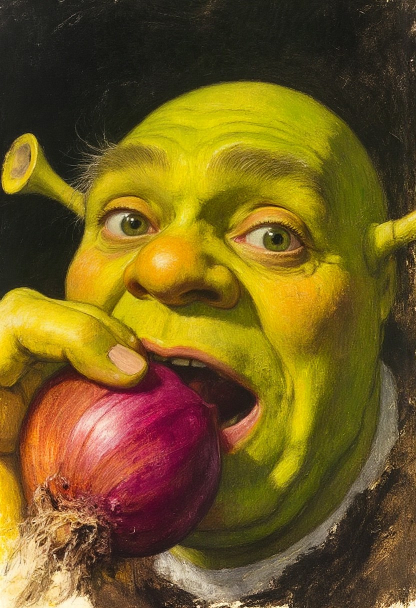 shrek, green ogre closeup biting into a juicy onion, 5 fingers , the scene is captured in dimly lit dark fantasy but vibrant colors, with bold ink lines defining form against the watercolor wash of the aged paper