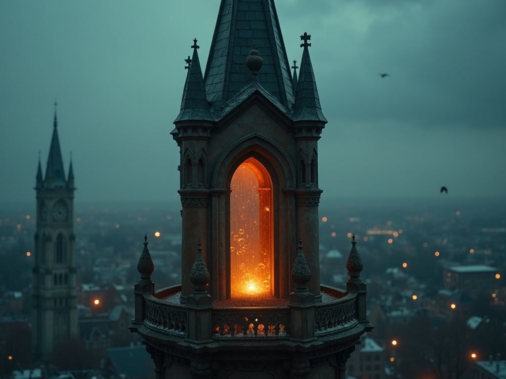 A Gothic bell tower rising above a sleeping city, each bell formed from hollow mandarin glass containing miniature storms, burnt orange rain frozen midair around the spire, wet stone gargoyles, dramatic sky, cinematic composition, 8k