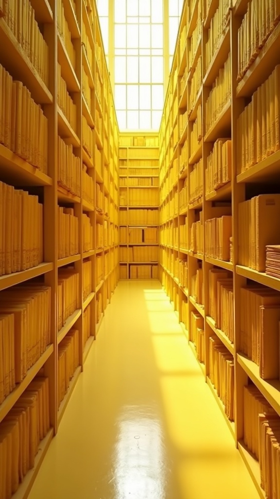 An old archive room with towering pale yellow shelves, endless stacks of soft yellow and lemon-yellow paper, yellow folders and books filling the space from floor to ceiling, tall windows with clean daylight, layered interior depth, realistic textures, highly detailed, atmospheric and elegant