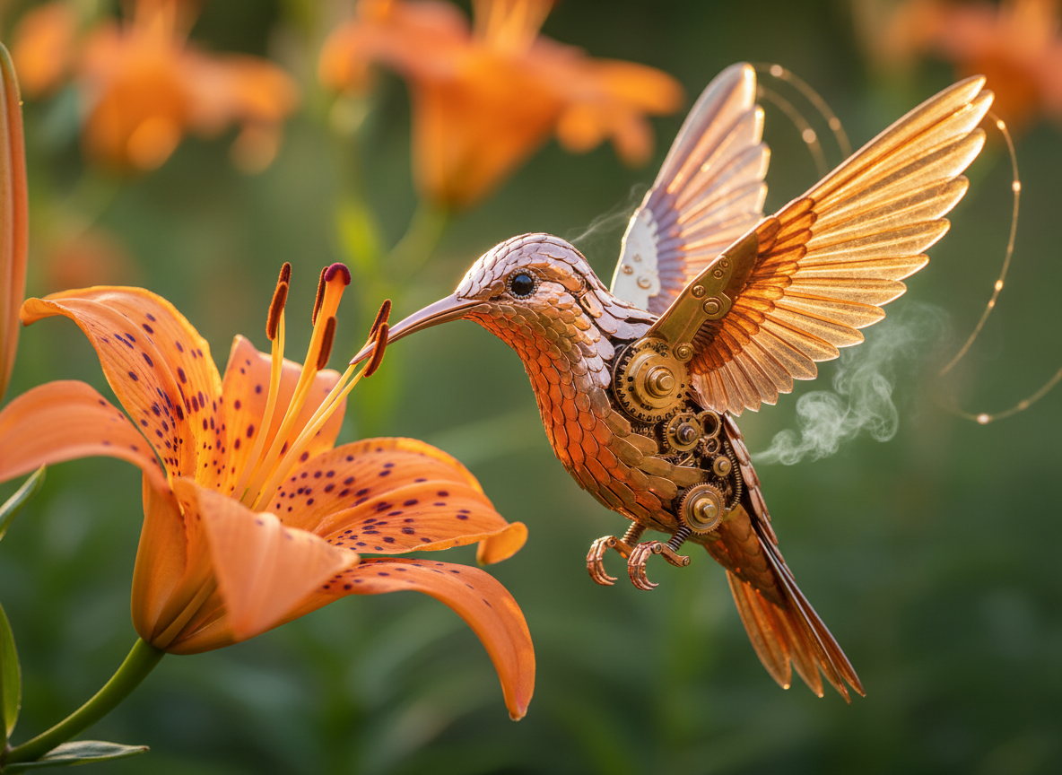 A hummingbird hovering at an orange tiger lily, but it is a tiny mechanical marvel, body polished rose gold and engraved copper with visible micro gears at the joints, wings of translucent amber tinted crystal spinning in a motion blur, a thin copper beak inserted into the flower, tiny exhaust steam venting from brass shoulder joints, each chest feather a separately articulated thin copper plate, macro photography, warm natural outdoor light, 8k