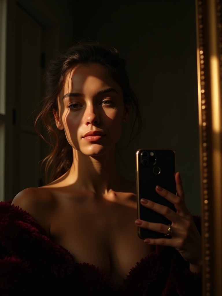 A selfie in a mirror in the style of Rembrandt, a young woman taking a selfie with a smartphone, light falling from a window creating deep shadows and bright accents on the face and phone screen, rich texture of skin velvet clothing and the reflective mirror surface, color palette of golden brown dark red and black, Caravaggesque lighting effect bringing drama to an everyday moment, detailed highlights and reflections on the smartphone screen, 8k