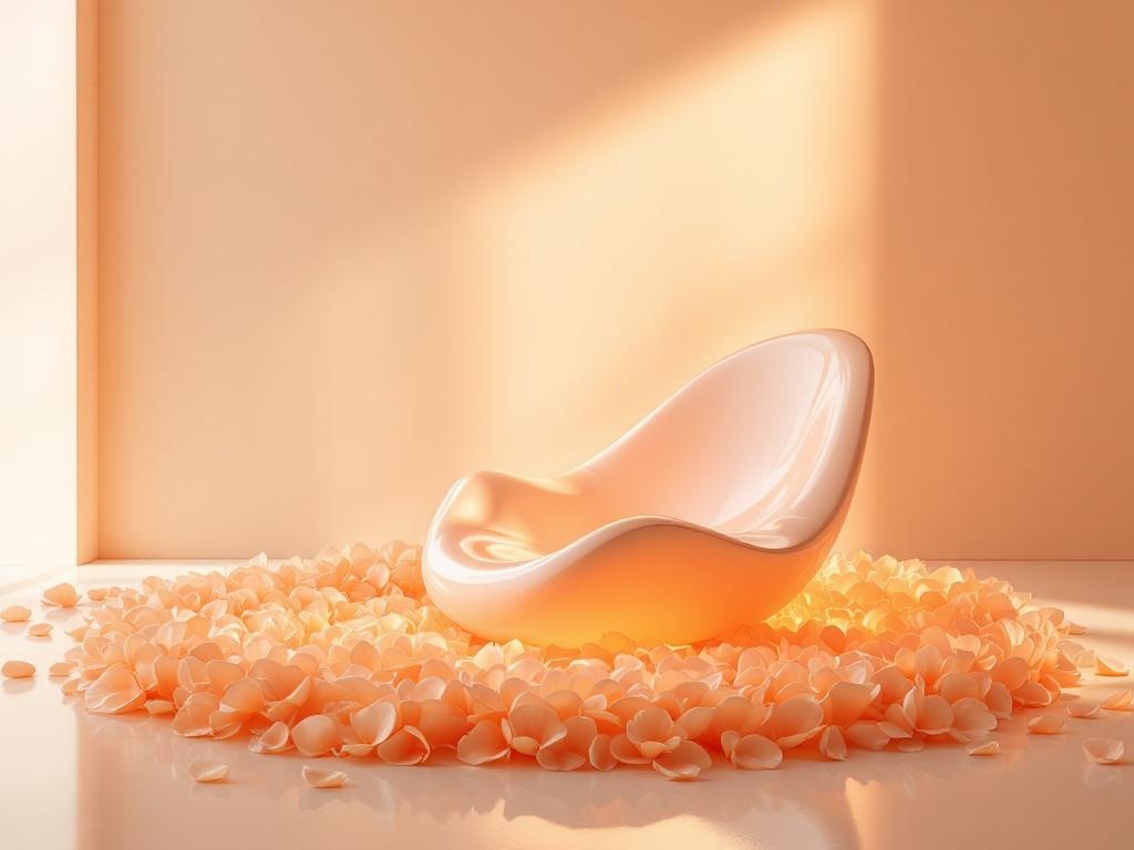 A sculptural lounge chair surrounded by a floating ring of translucent peach porcelain petals, light apricot glow, quiet gallery setting, luxury surreal design