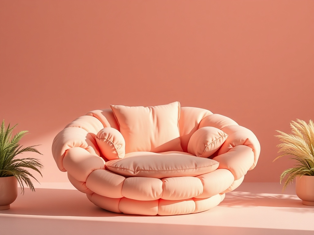 A sculptural lounge chair built from stacked peach mochi cushions and glossy sugar-shell arms, pastel pink gallery, luxury product photography, hero composition