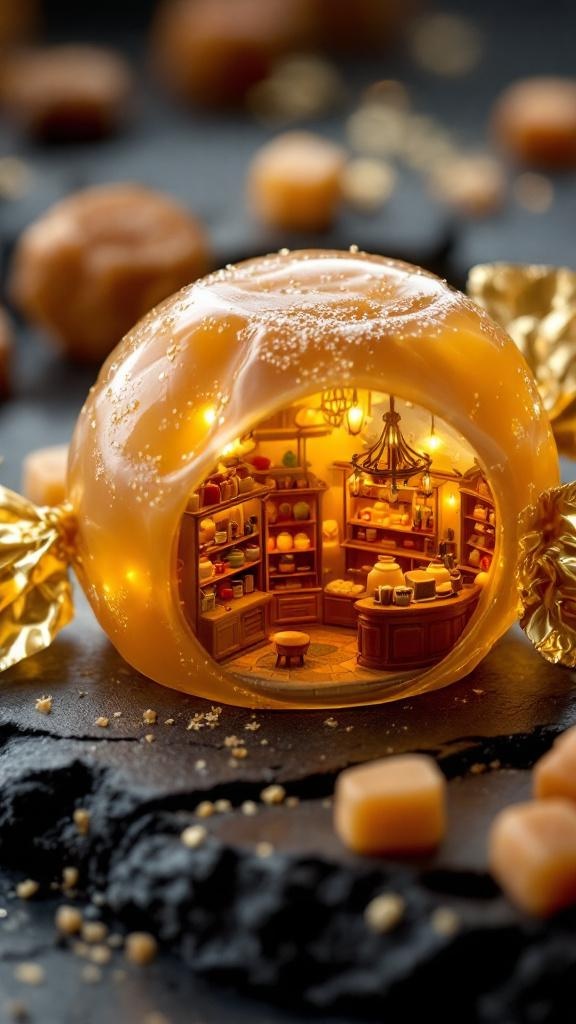 Extreme close-up of a large unwrapped butterscotch candy on dark slate, the transparent amber shell revealing a miniature confectionery shop inside — tiny shelves with even tinier jars of candy, a small counter with a brass register, warm golden-orange light from a miniature chandelier, the crinkled gold wrapper beside it like expensive fabric, the shop glowing warmly through the translucent walls, macro photography, 8k