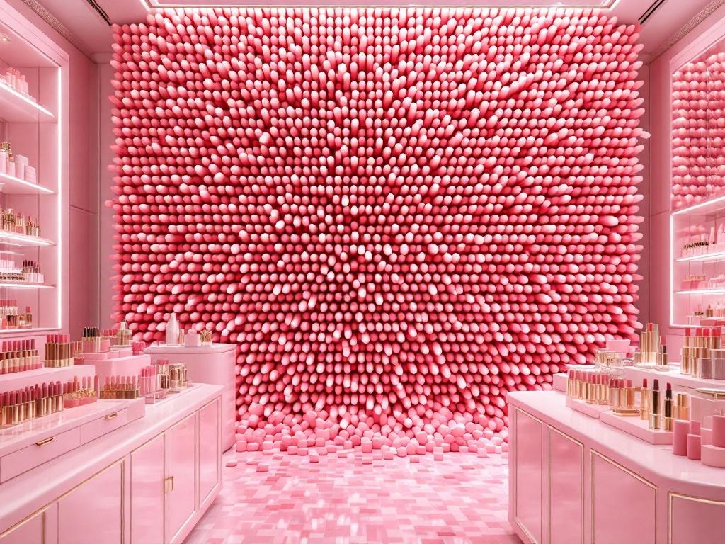 A luxury cosmetics boutique where a towering wall of blush lipsticks collapses in absolute stillness, thousands of pastel light pink caps frozen midair, cheeky pink reflections on lacquered counters, elegant disaster, sharp detail