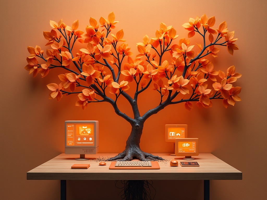 A minimalist control terminal grown from living orchard tissue, screens embedded in apricot bark, soft peach-orange leaves shaped like icons and tabs, natural orange data veins running through the branches, saturated mandarin pulses traveling along the interface, deep burnt orange root shadows beneath the console, nature as operating system, high-end product photography, richly layered, hyper-detailed