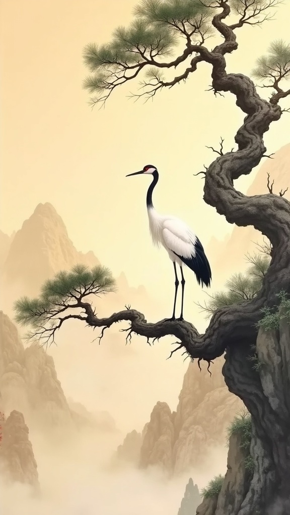 A white crane standing gracefully on a gnarled ancient pine tree branch extending over a misty cliff edge, in the style of traditional Chinese ink wash painting, pine trunk twisted and textured with bold dark brushstrokes, delicate green needle clusters, the crane painted with fine precise white and black strokes showing individual feathers, misty golden-sepia mountains fading into the distant background, subtle wash gradients suggesting fog and depth, the composition following classical Chinese landscape scroll proportions, warm aged rice paper tone, visible brush texture, traditional ink painting, 8k