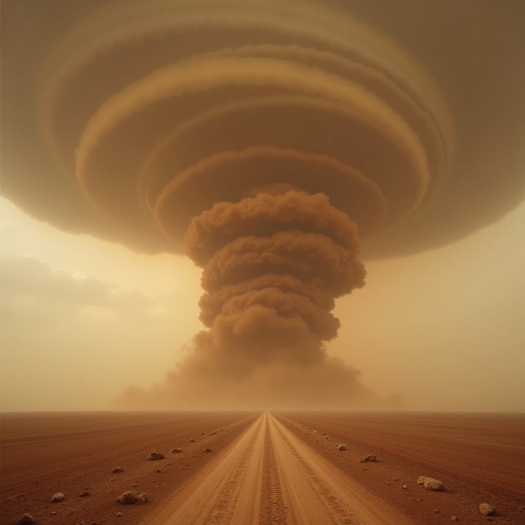 A towering spiral storm of dust and cloud descending onto an empty plain, layered brown atmosphere, one narrow road leading inward
