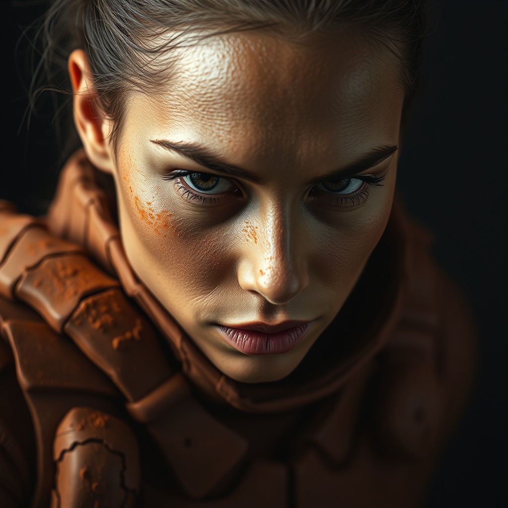A close editorial portrait of a woman wearing sculptural body armor made of wet terracotta clay, deep cracks revealing darker earth underneath, her skin dusted with dry ochre powder, one eye catching sharp light, raw elemental beauty photography, dark studio, 8k