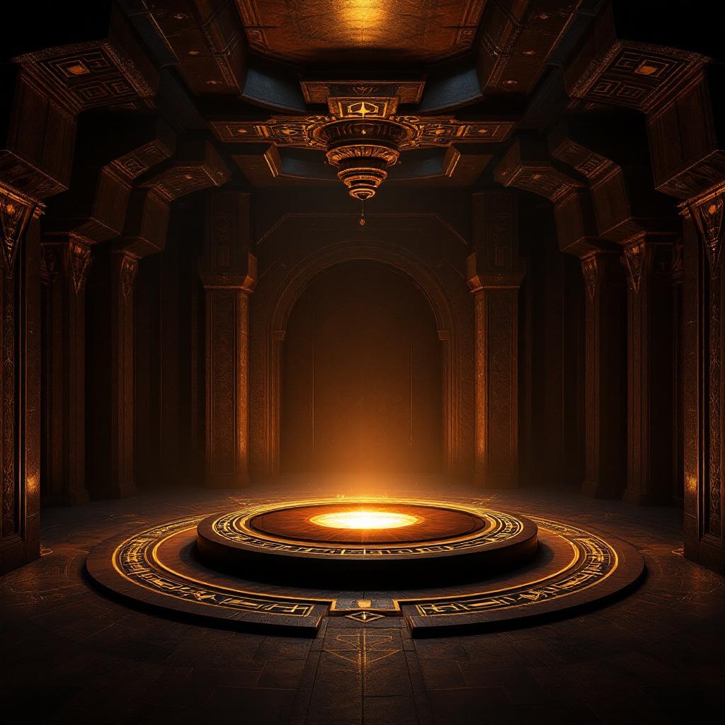 A vast ceremonial hall carved from dark walnut and polished resin, one glowing circular altar at the center, deep brown shadows, sacred cinematic realism
