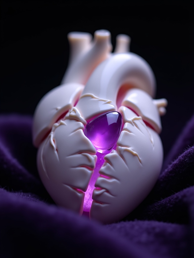 A porcelain anatomical heart resting on velvet, thin fracture lines filled with violet light, a small amethyst core beating through the ceramic shell, pale lilac sheen on the surface, black background, luxury macro photography