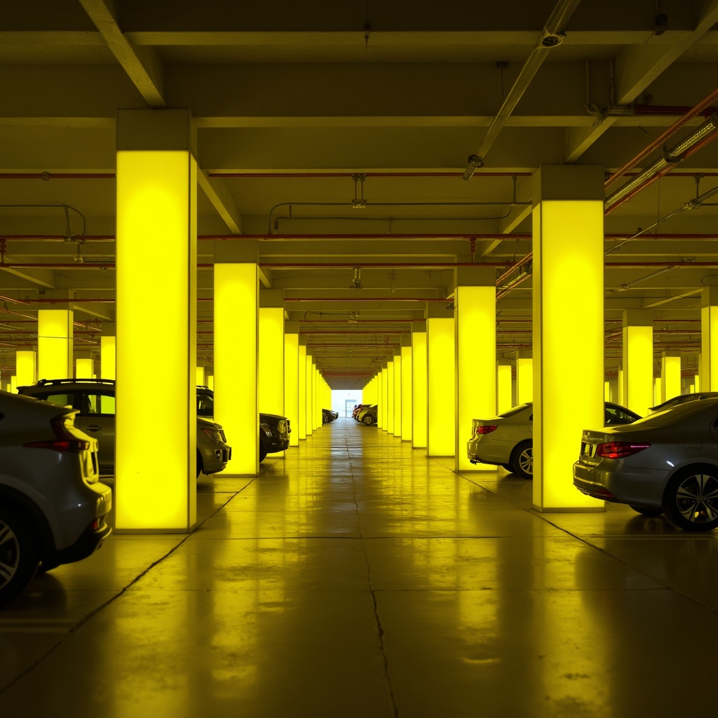 A city parking garage where every yellow safety line has lifted off the ground and become glowing vertical planes, turning the garage into a navigable maze of lemon-yellow light panels around parked cars, concrete realism, dramatic depth, unusual but grounded, sharp focus