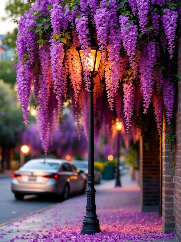 A black iron city street lamp on an ordinary grey sidewalk, the entire lantern top engulfed by cascading wisteria flowers in deep magenta and violet — dense hanging purple clusters dripping down like a living chandelier, petals slowly falling onto the dry pavement below forming a pink carpet, the lamp still glowing warmly inside the flower mass, a parked silver car and brick wall for context, golden hour light, 8k