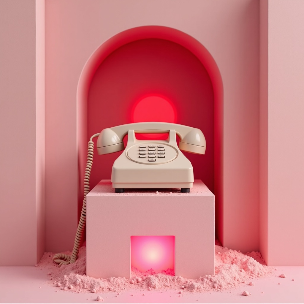 A vintage office answering machine displayed like a sacred relic in a niche of pale pink plaster, authentic pink dust on the pedestal, a hibiscus pink indicator light glowing like an altar ember, contemporary archaeology mood