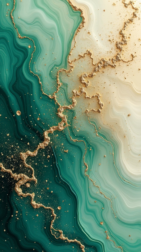 Abstract mixed-media texture in layered green, teal, gold, and ivory, with fluid paint, speckled metallic details, and translucent cells, luxurious decorative art, macro surface photography