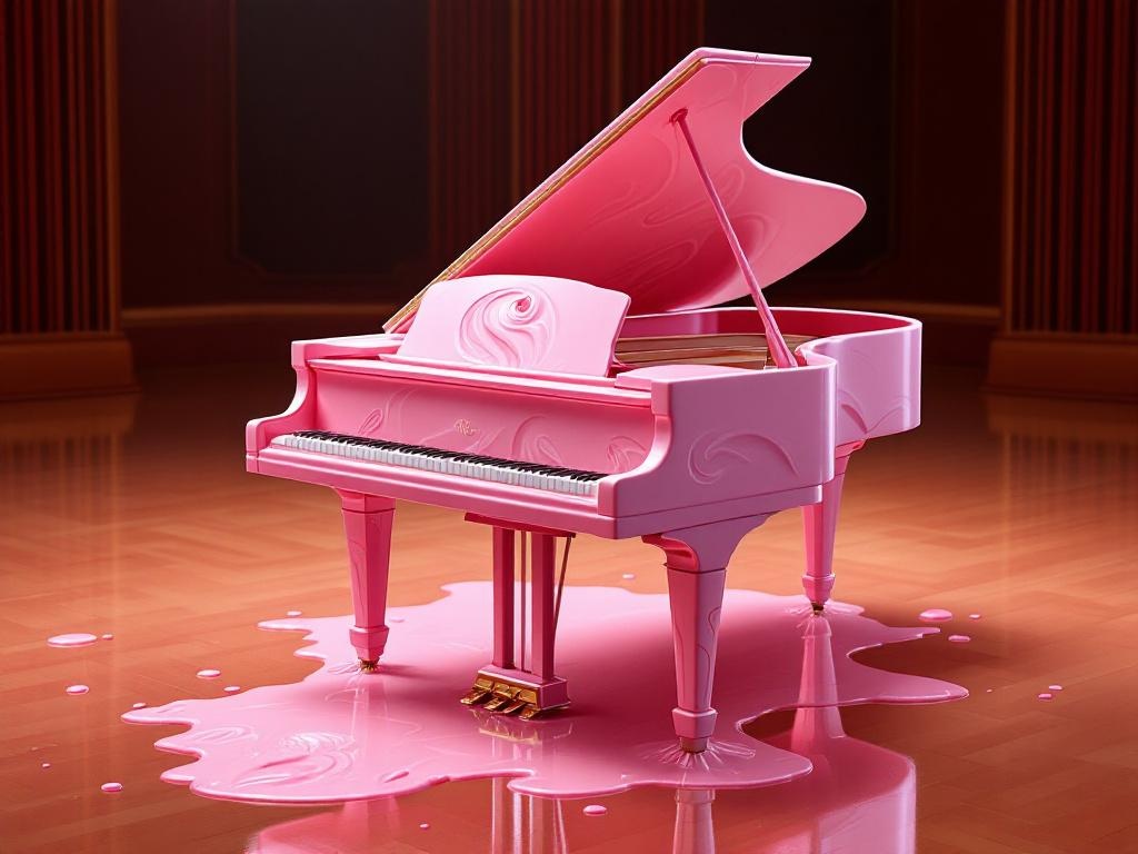 A grand piano standing on a concert hall stage, but the entire instrument is sculpted from smooth strawberry ice cream — the raised lid is a perfect slab of pink gelato with visible scoop swirl marks on the surface, the keys crafted from white vanilla and dark chocolate, the whole piano glistening with a thin melting sheen under the warm spotlight, a small puddle of pink melt forming on the polished stage floor beneath the pedals, photorealistic food textures, product lighting, 8k