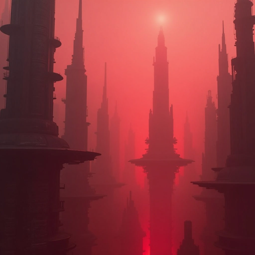 Visionary futuristic tower city rising through atmospheric mist, elegant vertical spires and layered platforms, wide cinematic composition, refined sci-fi architecture, volumetric light cutting through the haze, utopian but dramatic mood, entire environment transformed into a red color world with luminous crimson fog, wine-red shadows, and ruby reflections across the structures, premium epic realism, highly detailed forms, no cyan sky, no orange sunlight, no text