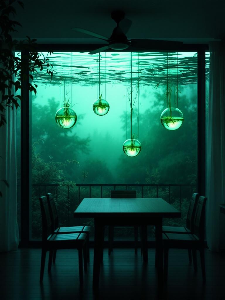 A quiet apartment dining room at dusk, the ceiling fan replaced by four suspended translucent green lakes held in the air like rotating glass basins, thin reeds and mint mist drifting above the dinner table, soft green ripples moving across the ceiling, deep forest corners framing the room, domestic realism interrupted by impossible floating water, atmospheric, hyper-detailed