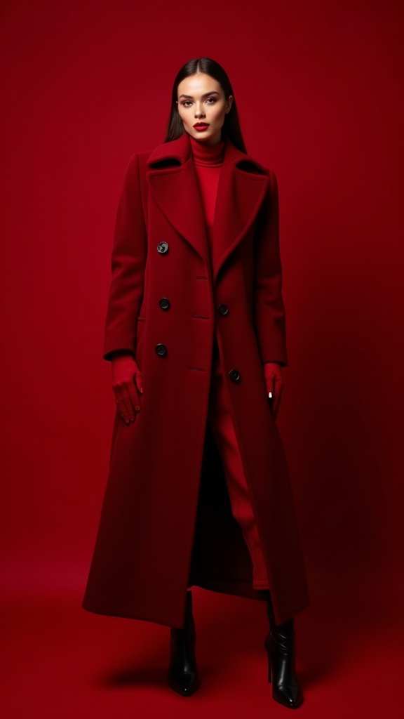 High-fashion editorial portrait of a woman in a sculptural coat and gloves, centered composition, direct gaze, monochromatic red styling, rich velvet and satin textures, seamless studio backdrop, soft diffused beauty lighting, elegant luxury mood, dominant deep crimson palette across wardrobe, background, and reflections, subtle tonal variation from ruby to wine red, premium magazine photography, clean negative space, highly detailed fabric texture, no competing colors, no text