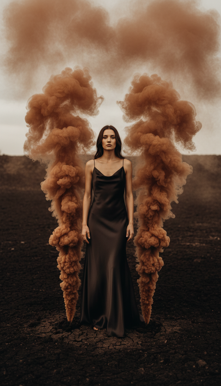 A woman standing still while burnt-sienna smoke twists upward around her body in tall sculptural plumes, dark ground, luxury cinematic realism