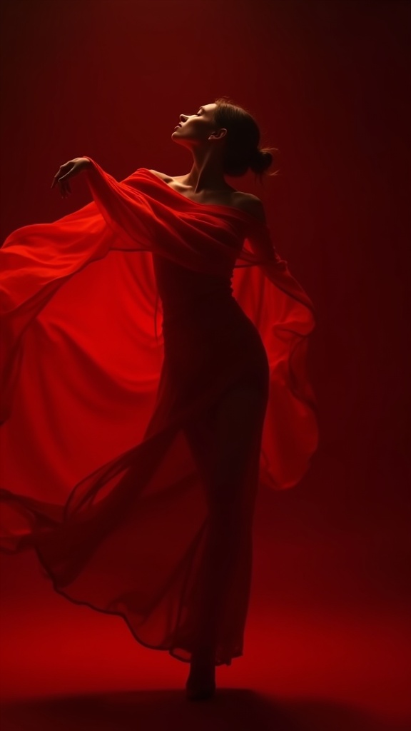Cinematic image of a dancer wrapped in flowing red silk captured mid-motion, sweeping fabric arcs filling the frame, monochrome scarlet atmosphere, dark studio background with subtle red haze, elegant movement, luxurious fashion campaign mood, soft highlight bloom, rich contrast, highly aesthetic, no competing colors