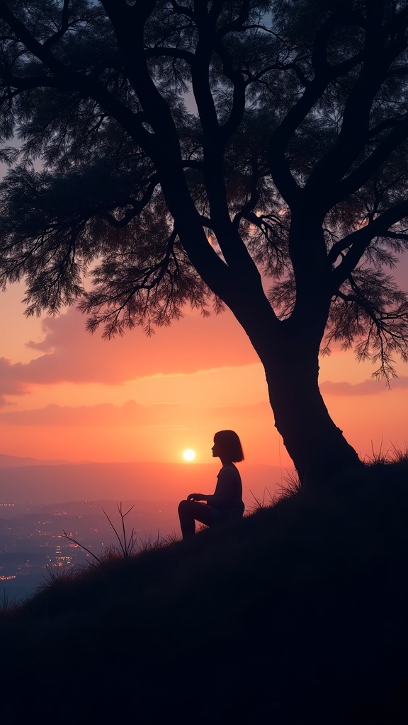 A silhouette of a girl sitting alone under a large tree on a hilltop at sunset, her profile dark against a glowing sky of warm peach orange and soft pink fading to deep blue above, the tree branches spreading wide as a dark frame, distant city lights twinkling below on the horizon, the mood contemplative and quiet, cinematic photography, 8k