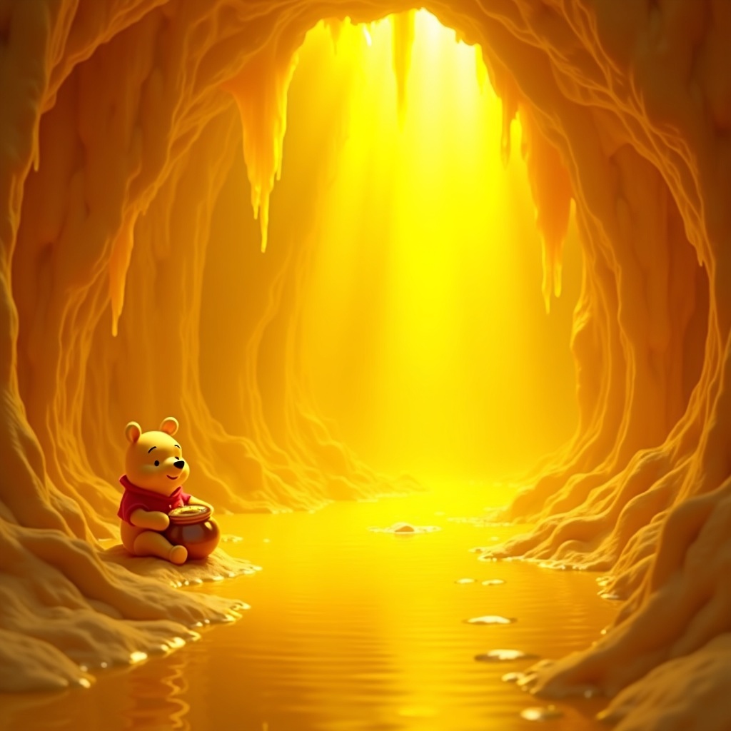 A vast underground cave where thick bright vivid yellow honey cascades down luminous yellow crystal walls forming a glowing yellow honey waterfall, a radiant canary-yellow honey lake at the bottom reflecting yellow light everywhere, a cute chubby cartoon bear resembling Winnie the Pooh sitting at the edge of the honey lake happily eating honey from a big pot, a beam of sunlight breaking through a crack in the ceiling creating intense yellow honey mist, everything saturated in vivid pure yellow, surreal fantasy atmosphere, highly detailed, sharp focus