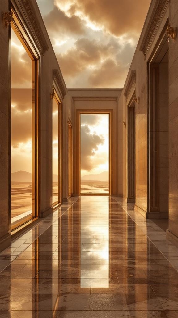 A neoclassical courtyard lined with giant brown-tinted mirrors, one mirror opening into a distant desert storm instead of a reflection, high-end surreal design