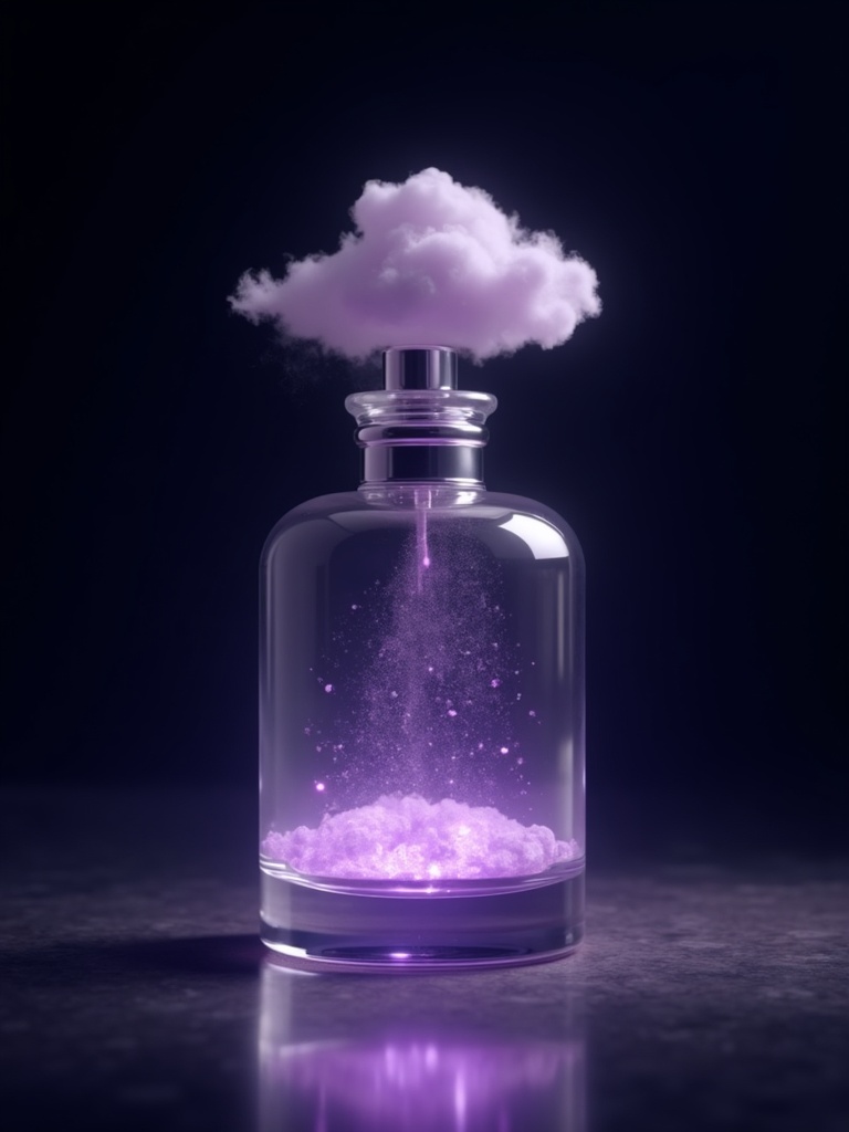A luxurious perfume bottle containing a floating weather system, a soft lavender cloud releasing tiny lilac rain inside the glass, a faint amethyst glow around the stopper, cool silver highlights, black velvet backdrop, elegant surrealism, ultra-detailed, polished reflections, museum-quality lighting