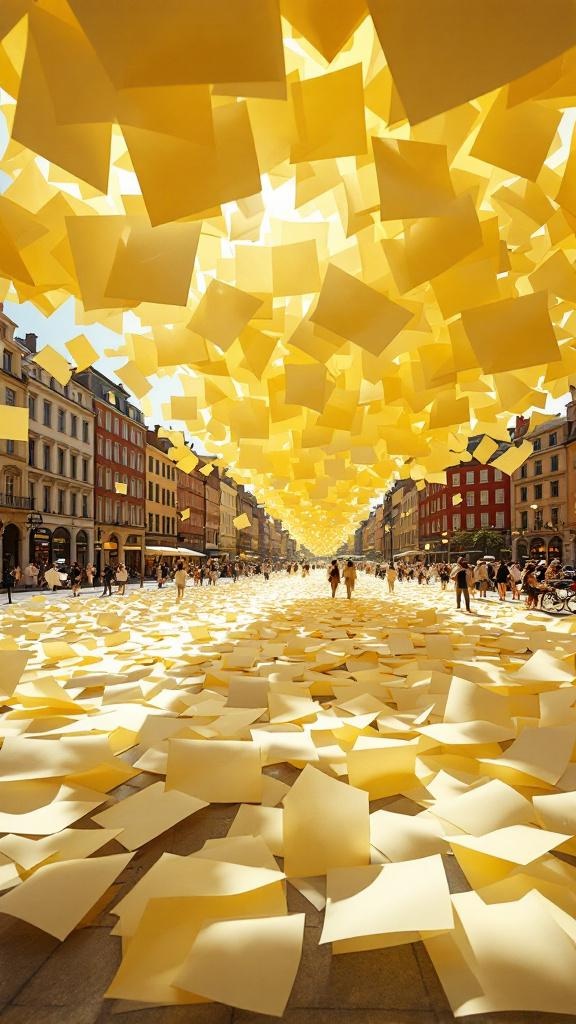 A broad city plaza overtaken by a surreal installation of thousands of pale yellow and lemon-yellow paper sheets suspended midair, as if a paper storm had frozen in motion, sheets casting layered shadows across the square, old facades around the plaza, clear daylight, immersive architectural context, elegant chaos, realistic paper texture, cinematic composition, highly detailed, sharp focus