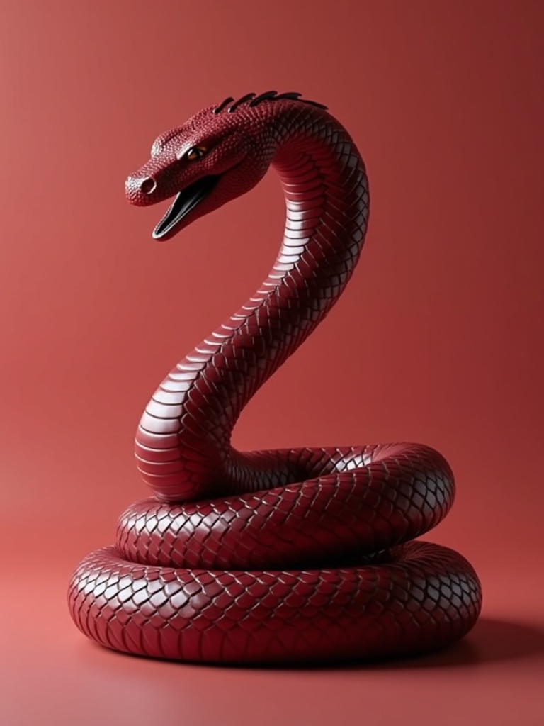 Minimalist studio render of a coiled serpent sculpture with glossy lacquered scales in deep crimson and dark wine-red, centered on a clean seamless background, dramatic side lighting, sharp reflections across the scales, premium gallery-object aesthetic, powerful silhouette, visually rich but controlled, no text