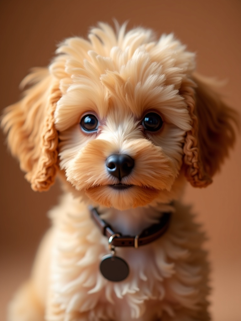 Close up portrait of a tiny apricot toy poodle puppy with fluffy curly fur and big round dark eyes looking directly at the camera, a small black nose, wearing a thin dark collar with a tag, the expression sweet and curious, warm soft background, pet portrait photography, shallow depth of field, 8k