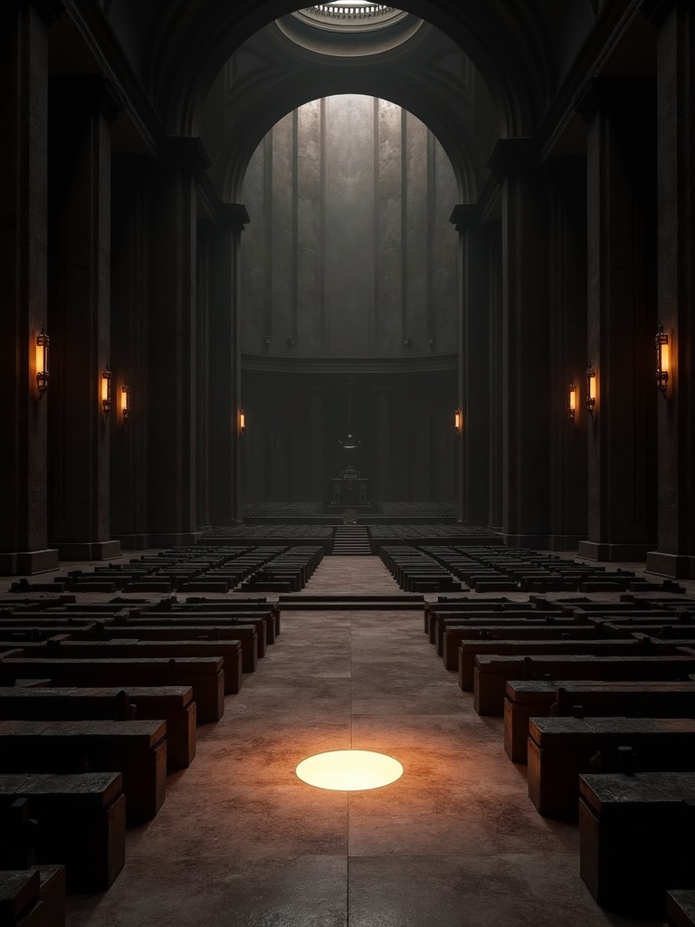 A dark ceremonial senate hall with endless rows of stone seats, deep brown resin floor, one glowing circle at the center, imperial silence, epic symmetry