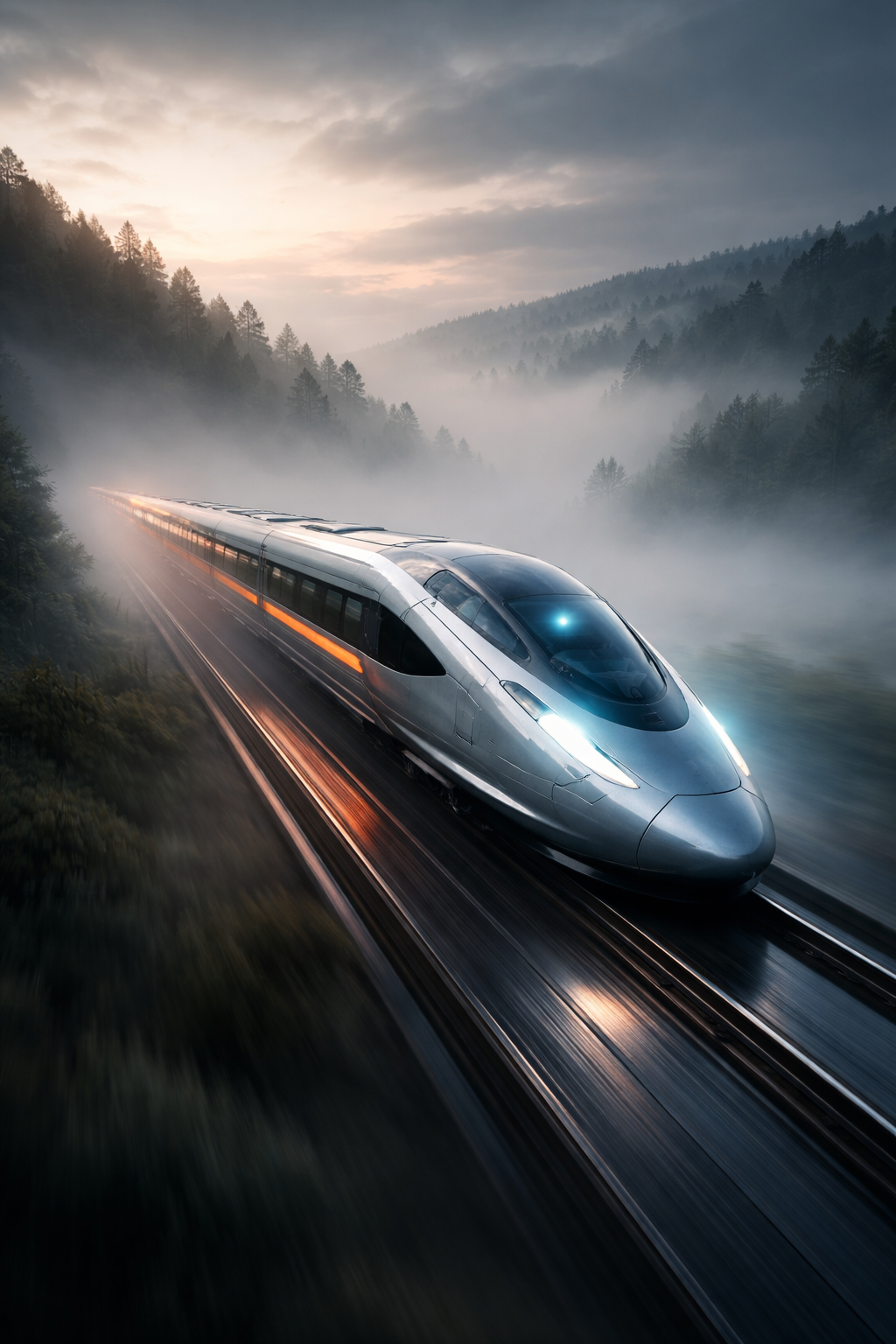 A futuristic train cutting through a foggy morning landscape, cinematic angle, smooth motion
