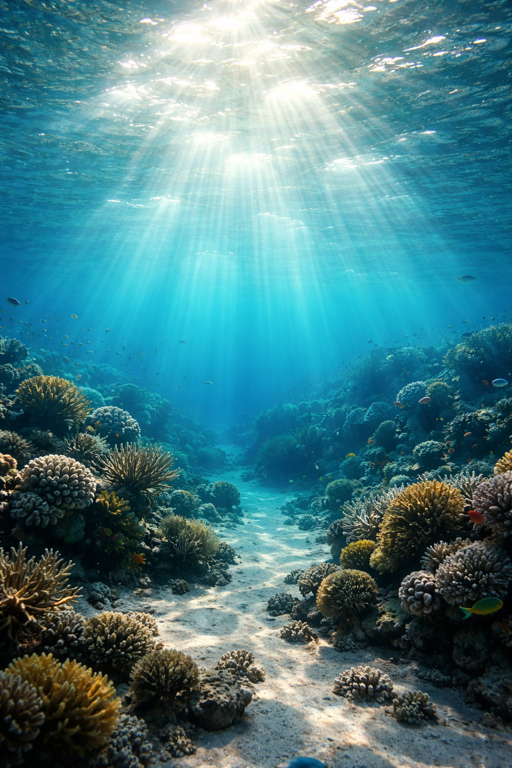 Underwater world with sunlight rays piercing through the water, slow and peaceful motion