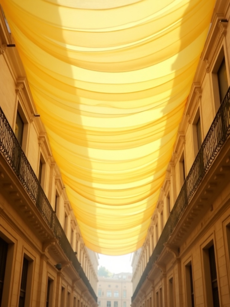 A narrow historic street covered by enormous layers of pale yellow, soft yellow, and lemon-yellow fabric canopies suspended between the buildings, the cloth filling most of the sky like a floating ceiling, cool daylight filtering through the fabric, soft haze in the distance, detailed stone facades, elegant balconies, long perspective, immersive environment, realistic textures, richly layered, sharp focus