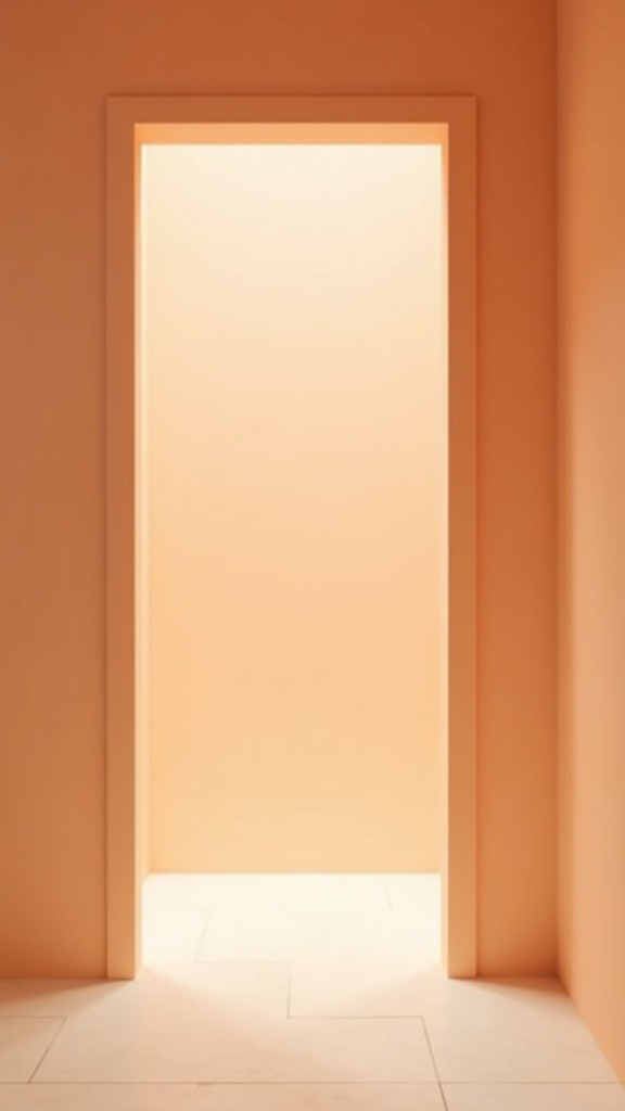 A minimalist powder room where the doorway opens into dense pale peach haze instead of another room, apricot walls and creamy stone floor, clean architectural surrealism, sharp focus