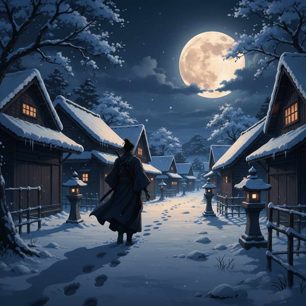 Alone samurai walking through a snowy Japanese village at night, his dark silhouette against blue moonlit snow, a large warm full moon low in the sky, traditional wooden houses with snow on the roofs, his katana visible on his back, footprints trailing behind in the fresh snow, the palette deep indigo blue and cold white with warm amber moonlight, anime illustration style, 8k