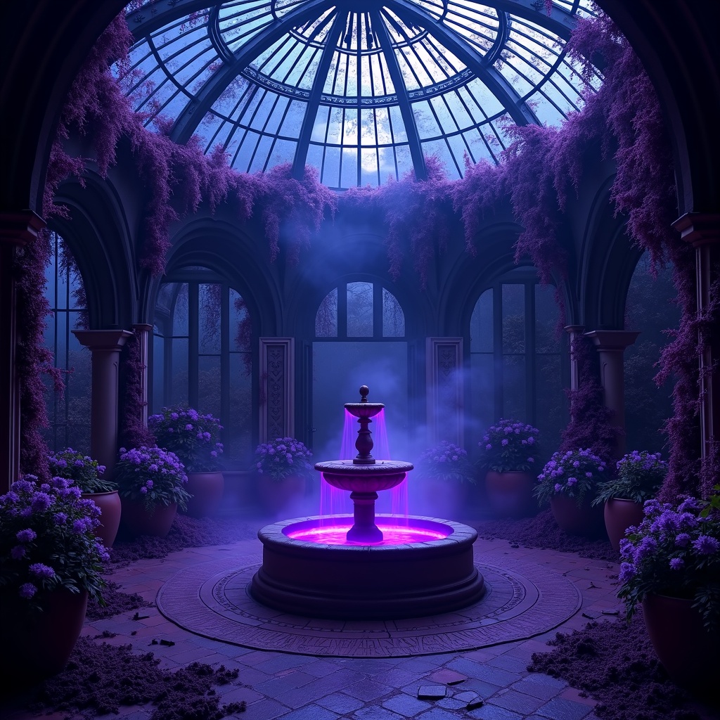 A vast Victorian greenhouse with a shattered glass dome, overrun by enormous bioluminescent violet flowers and creeping amethyst vines, wrought iron framework draped in glowing purple moss, a stone fountain in the center overflowing with liquid that shimmers lavender, moonlight mixing with the organic purple glow, broken terracotta pots and scattered soil, fog rolling across the tiled floor, dark botanical horror photography