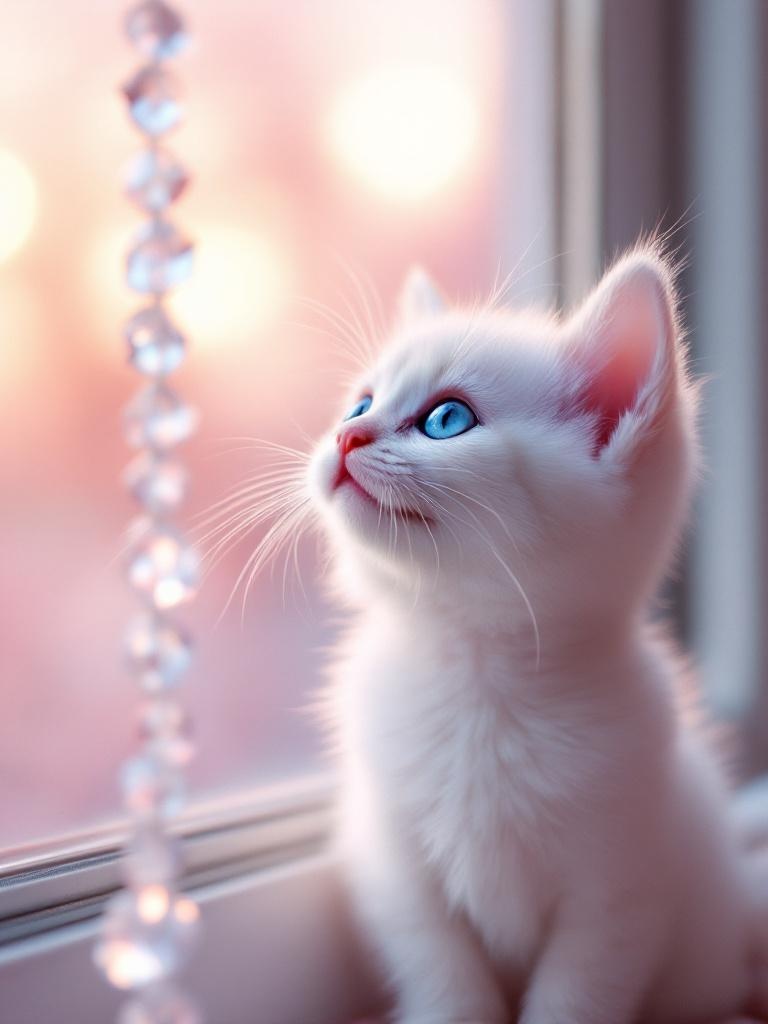 A tiny white kitten with blue eyes looking up through a window, soft pink and peach sunset light glowing behind, a string of small crystal glass beads hanging in the foreground catching the light like tiny prisms, the scene dreamy and soft with a warm pastel color palette, shallow depth of field, intimate pet photography, 8k