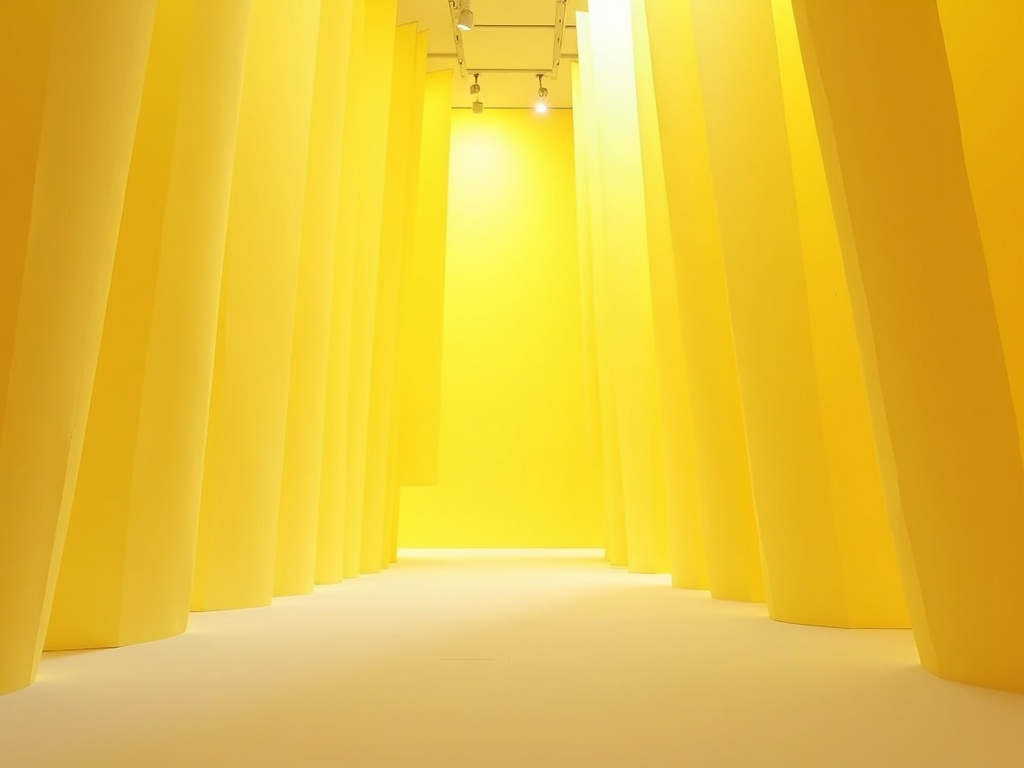A contemporary gallery installation filled with hundreds of suspended translucent pale yellow and canary yellow paper sheets, layered from floor to ceiling, soft neutral light passing through them, clean minimal architecture, immersive spatial depth, realistic textures, elegant composition, highly detailed, no orange tones