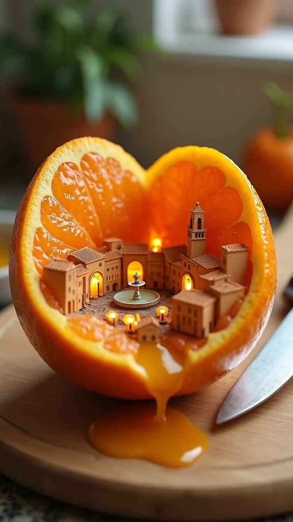 A large orange sliced in half on a kitchen cutting board, but inside instead of pulp there is a tiny detailed Mediterranean city — terracotta rooftops and narrow streets built between the membrane walls, miniature amber street lamps glowing, a tiny piazza with a fountain visible in the center segment, juice pooling on the cutting board like a flood, a kitchen knife nearby, macro tilt-shift, 8k
