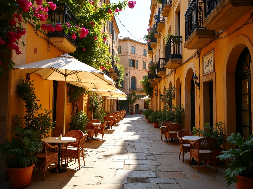 A charming narrow cobblestone street in a Mediterranean old town, lined with small cafe tables under cream canvas umbrellas, warm terracotta and golden sandstone building facades on both sides, lush pink bougainvillea cascading from wrought-iron balconies and window boxes, potted green plants and climbing vines framing doorways, dappled warm sunlight filtering through the canopy creating light patterns on the stone pavement, the street gently curving into the distance ending at a sunlit archway, a few empty wicker chairs inviting the viewer to sit, European travel photography, golden afternoon light, 8k