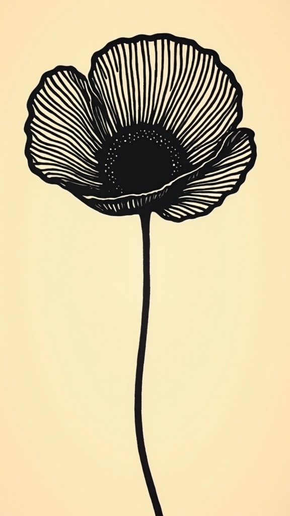 A single large poppy flower rendered in bold black ink parallel lines on a warm kraft beige background, the petals made entirely of thin undulating stripes following the organic curves creating a hypnotic pattern, the center dark and dense, a thin stem at the bottom, the style graphic and modern between woodcut and op art, high contrast black on warm tan, 8k